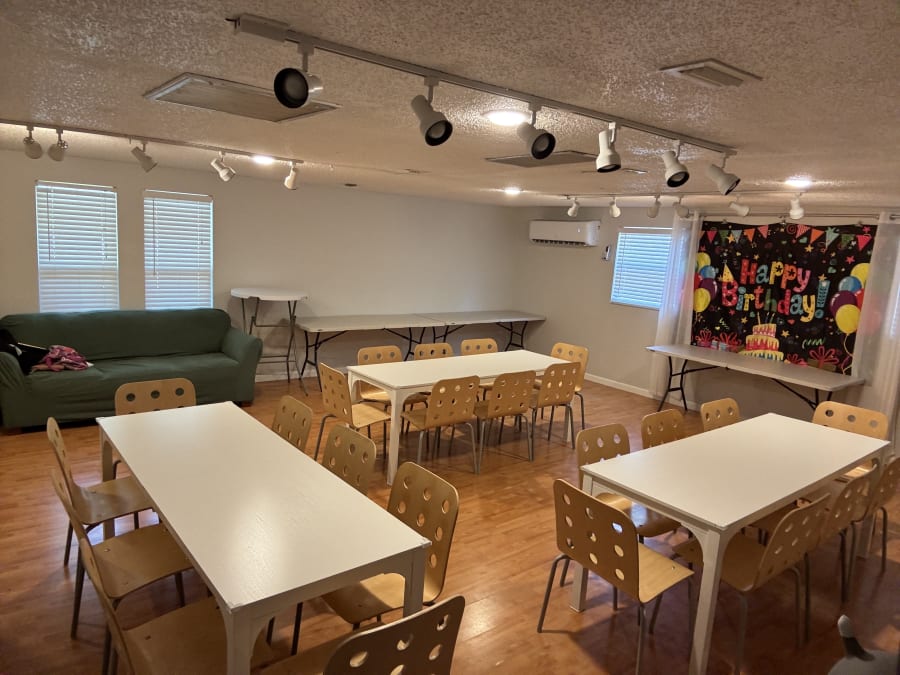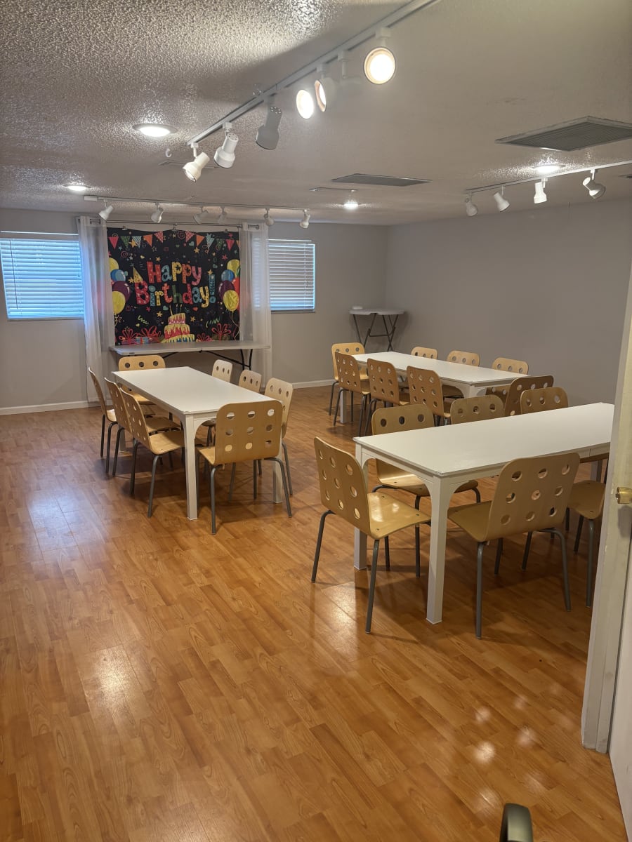Space includes (3) full size party tables with 18 chairs set up - up to 24 chairs available